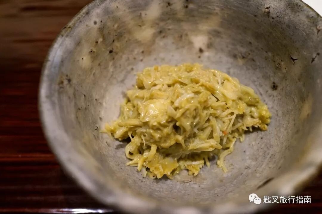 米饭煮得偏湿, 混合间背子蟹(雌)的籽(外子)、黄(内子)和肉(身), 加上两粒像黄绿色宝石般的银杏, 黏稠滑溜的口感中带有蟹籽的噗呲噗呲有趣食感。