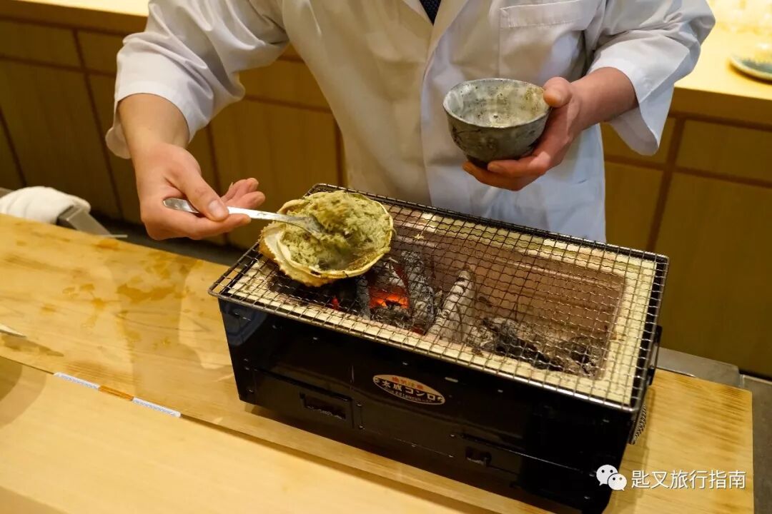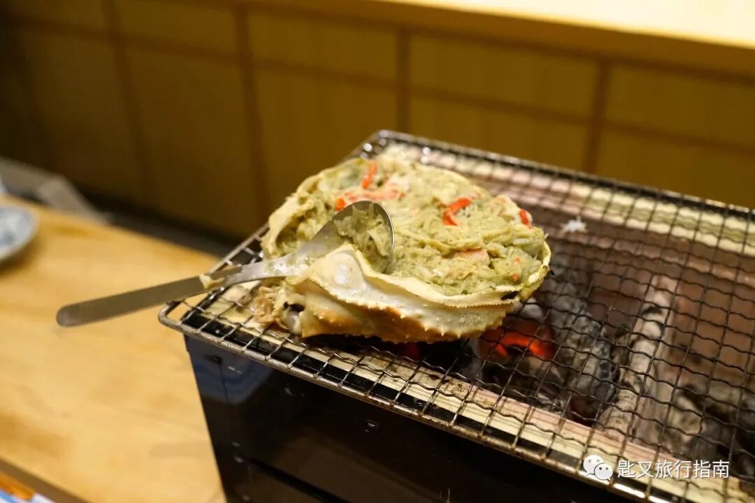 趁我们在吃蟹腿的时候, 装满蟹肉的蟹盖被置于炭火上, 烤得整间屋子香气满溢, 一小钵蟹黄拌肉之后, 后加入高汤和日本酒, 做成蟹肉汤。