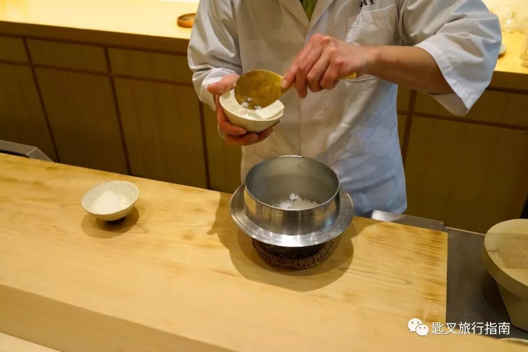 这里没用惯常的腌菜, 而是采用金黄色的新鲜乌鱼子、新鲜黑胡椒和盐昆布来配, 这时候还上了一碗救世主般的白米饭。