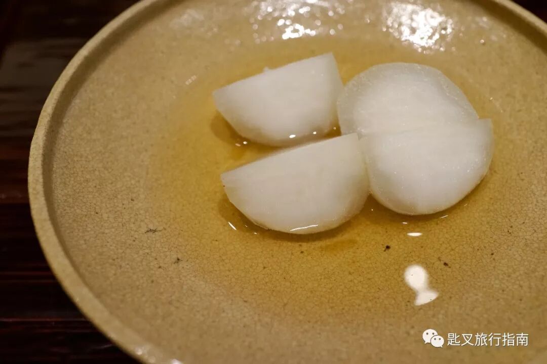 一路吃下来, 微微觉得荤菜偏多了些, 刚想提出能不能上个蔬菜, 大将就端出了一颗雪白光洁的芜菁, 至简到纯粹的地步, 恰好洗刷掉野鸭肉留下的浓厚肉味。