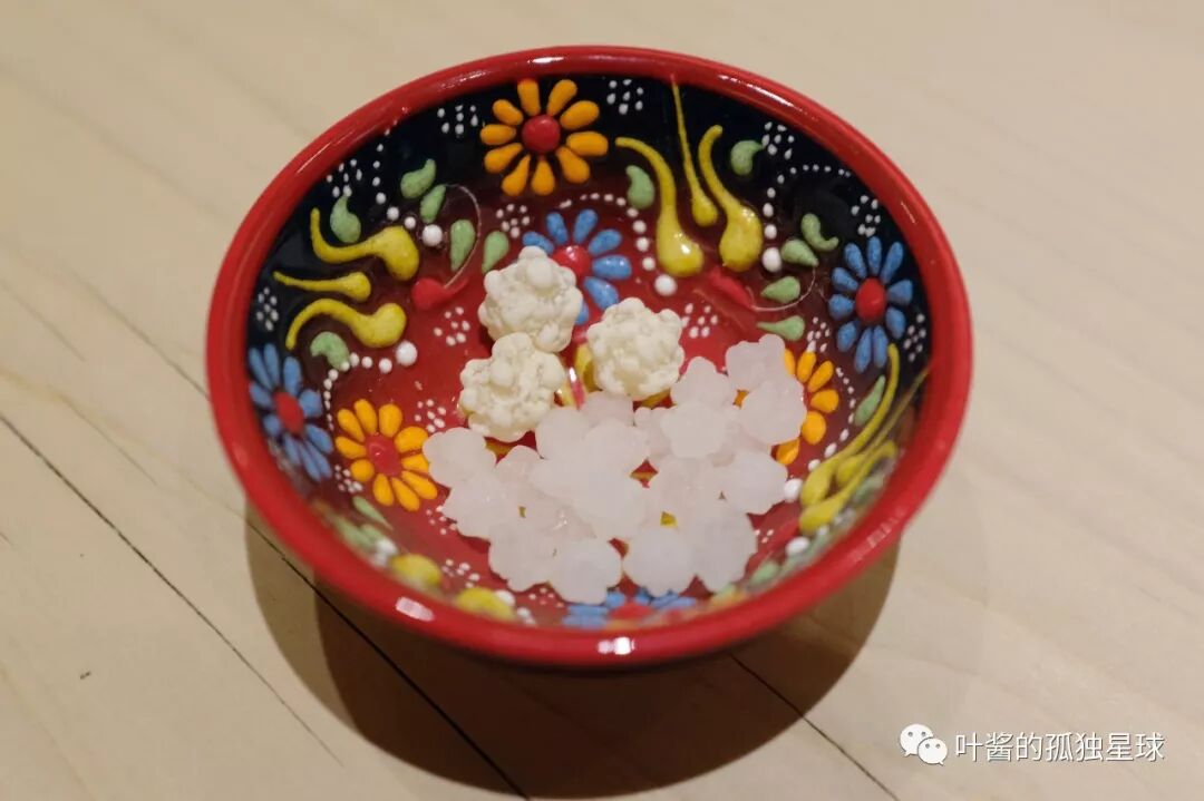 金平糖, 一款甜, 一款有酸味和苦味, 放在与其他食器风格迥异的小碗里。
