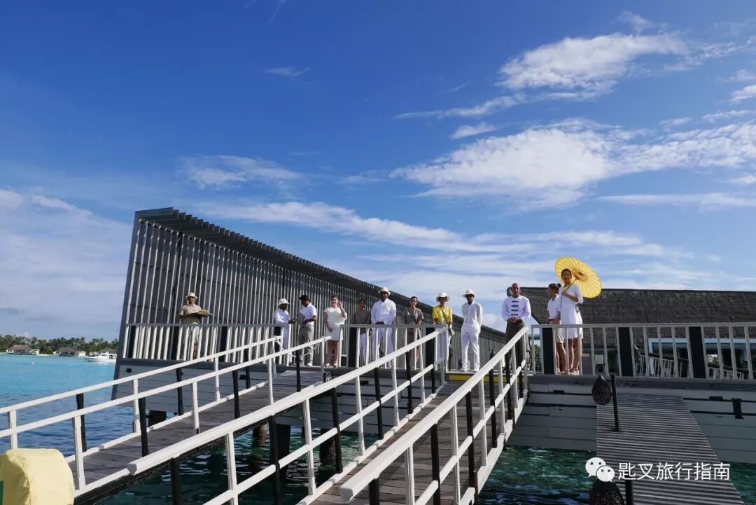 步出马累机场的瞬间,在即刻感受到热带海岛的潮湿和闷热的同时,也开启了白马庄园的行程——身着白马庄园标志性蓝、白、黄艺术图纹服饰的接机人员,举着ipad在出口等候,省去了前往水上飞机柜台登记的繁琐事宜。