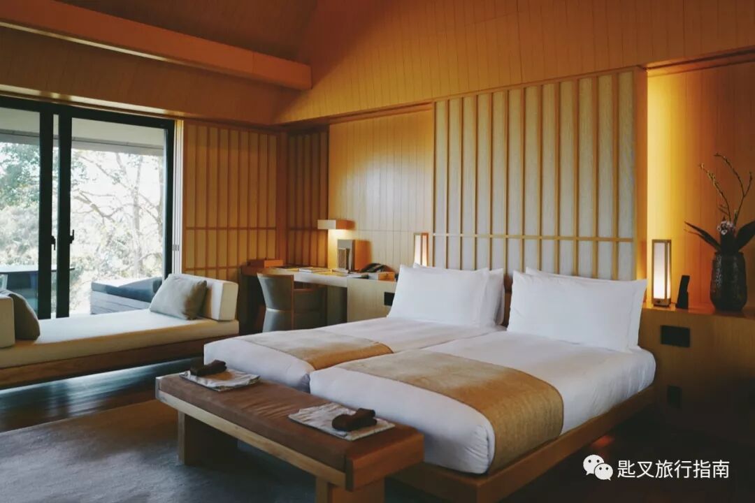 一直都非常喜欢Kerry Hill的窗景设计。这扇窗是自然与文明的边界,也是人与环境对话的窗口。Amanemu的落地窗设计沿袭了日本古典美学风格,以天然材质构筑而成,精美织品与木质滑门点缀门户,素手轻拉,便可拥入一院日式自然美景。房内两扇大落地窗相对呼应,使自然光线布满整个房间。