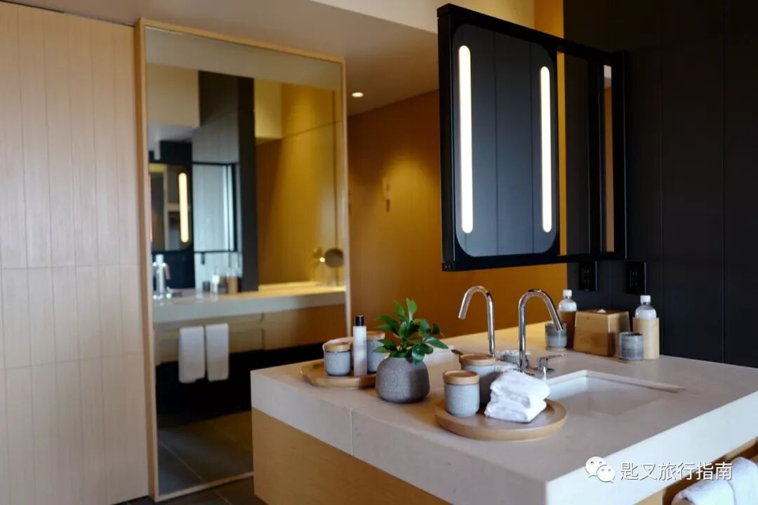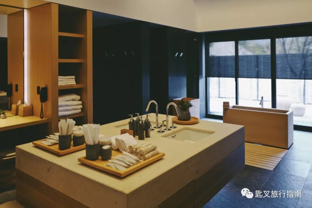 洗手间与衣帽间相连,空间同样感人,正反相对的双台盆设计相当巧妙,还贴心设有镜面巨大的梳妆台,嗯,对所有设置梳妆台的酒店总是有莫名好感。同样享有无敌窗景的私人温泉,泉水源自附近天然泉眼,矿物质丰富。浴缸的size与东京安缦的套房相当,是普通房型的两倍,地广人稀轻松得分。
