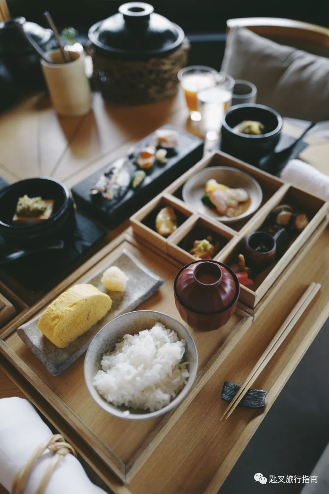 日式早餐被装在木盒中呈上,主食可选米饭或粥,配菜包括腌渍的海鲜,刺生,各式酱瓜,玉子烧,一夜干,海藻汤豆腐。
