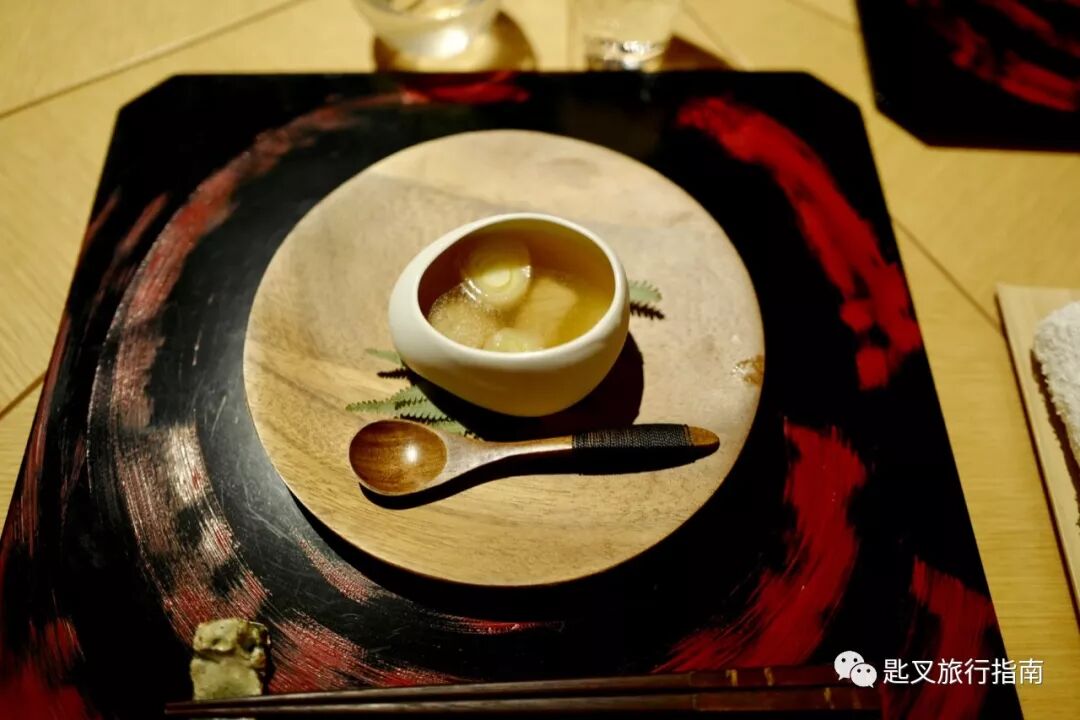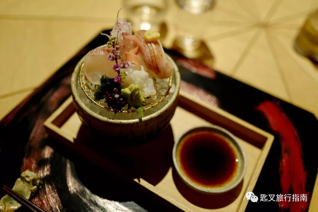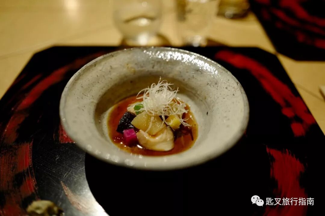 晚餐菜单分为套餐和单点,丰富程度超乎想象。我们选择了名为HIBIKI的套餐,内有包含伊势龙虾刺身、松阪和牛赤身和涮涮锅在内的7道菜。从前菜到主食,口味都比较清淡,清一色酸口调味,不知道算不算三重特色,开始还有点不习惯,吃到最后倒觉得风味十足。