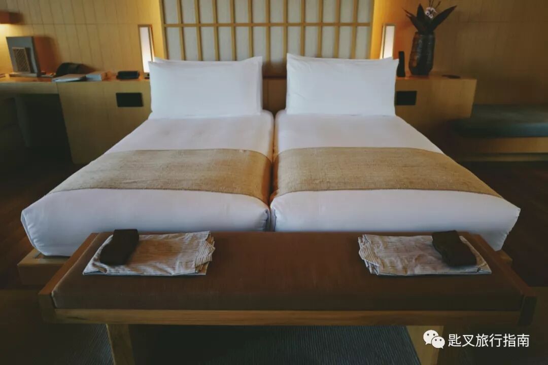 除了实力选址之外,安缦能够在尊重地方传统的同时,保证全球统一的度假水准,显示出了极高的情商。Amanemu在传统日式温泉旅馆与现代度假习惯中完美平衡,光这一点,就足以成就其安缦代表作地位。浴缸式的私汤更符合外国游客的使用习惯——可自由调节的水温,可随时更换的池水,在这些细节上都避免了文化冲突。而玄关处放置了两双棉拖鞋,进房立刻换鞋,以及窗台边供室外穿着的木屐,又是典型的日式旅馆的做派。