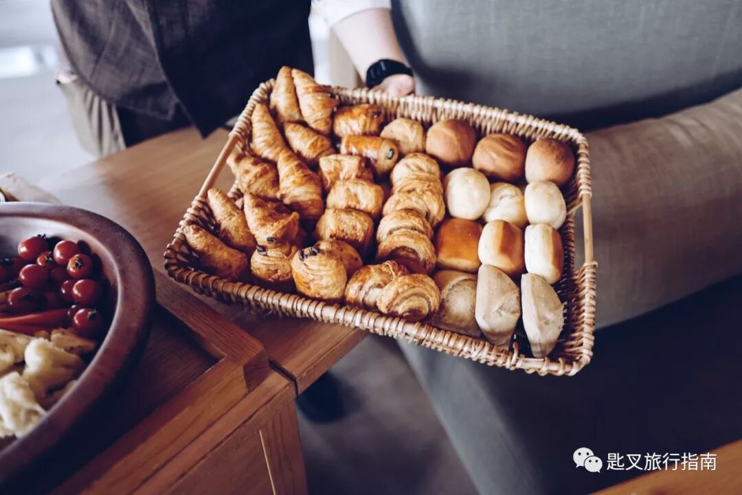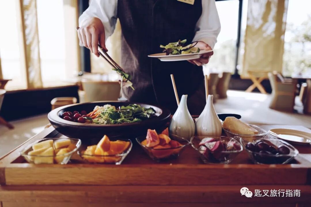 西式早餐的仪式感丝毫不逊色于日式套餐。一辆与桌椅同款质地的推车,载着丰盛的面包篮,五花八门的水果,和脸盆般大的一盘蔬菜到我们桌边,侍者会现场根据你的口味制作沙拉。