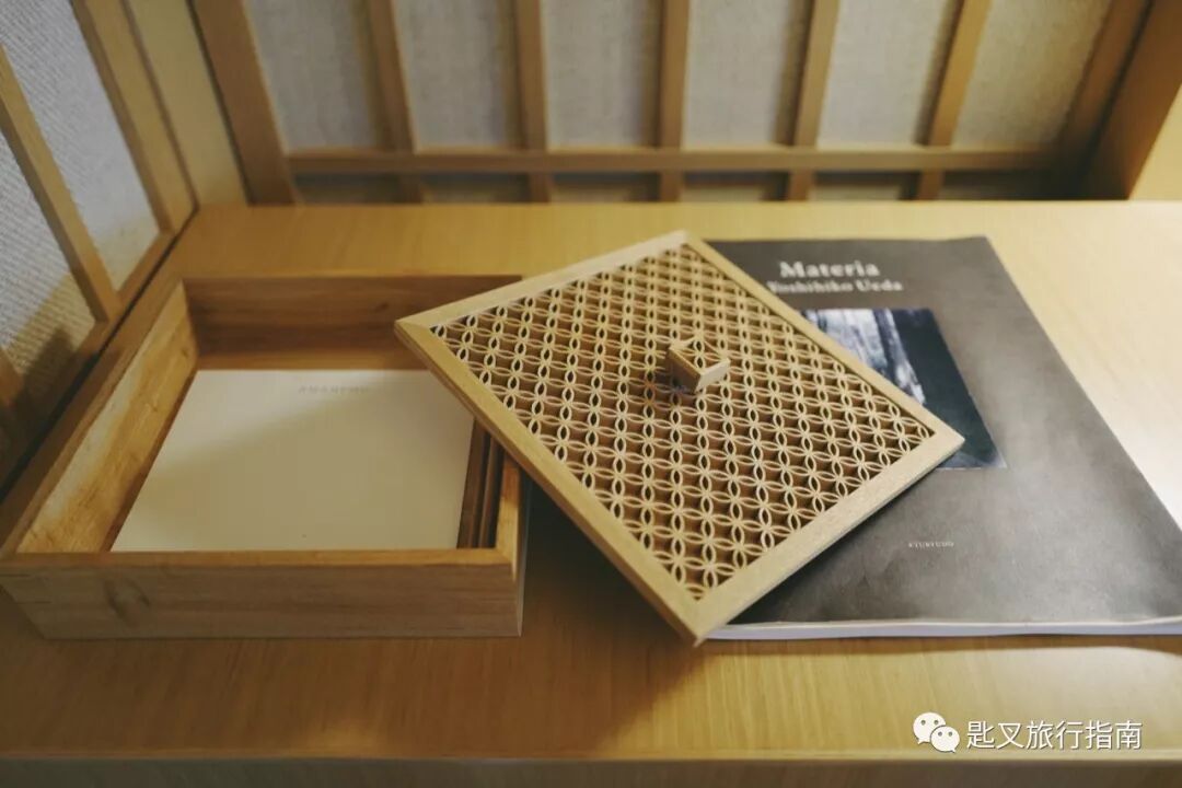 书桌上立着酒店实用信息,并摆放着一本安缦集锦和一本熊野古道影集,非常适合送茶。收纳便签纸的精致木盒,如果没记错的话,东京安缦也有同款。