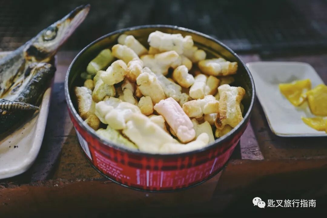 最后老太太还为我们做了一份特别的零食——年糕干,五颜六色的年糕条被烘烤得胖乎乎香喷喷,嘎啦松脆。这也是海女们出海必备的能量零食,饿的时候吃上几块充饥又好吃又方便。