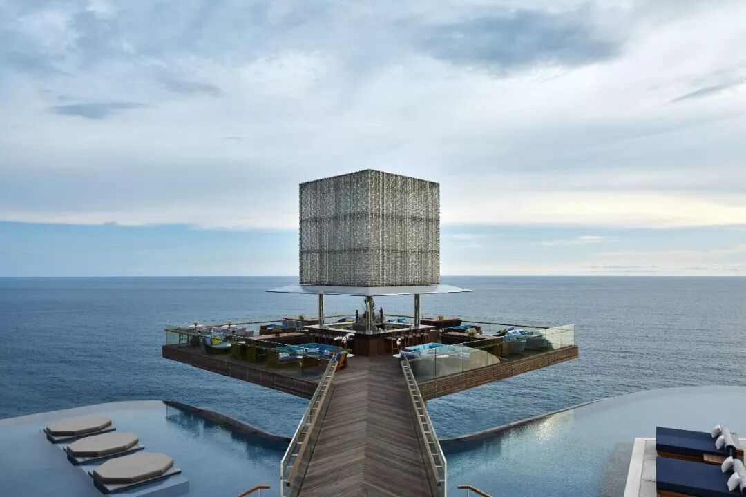 OMNIA有官网可以提前预订自己喜欢的位子,最推荐的是day bed。好似悬空在悬崖之上的“方块”在阳光下闪烁着金光,而在夜间则会交替不同的颜色,每个时段都变幻莫测。