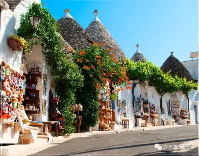 被誉为天堂小镇阿尔贝罗贝洛拥有1500多座精美的特鲁利建筑,由白墙和用灰色扁平石块堆成的圆锥形屋顶组成,分布在错落起伏的山丘上,充满童话的趣味。独树一帜的建筑风格也让小镇被选为联合国教科文组织的世界文化遗产。
