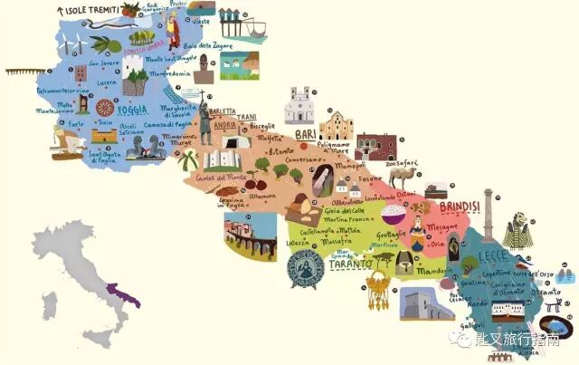 地处罗马与希腊文化的交界处,普利亚自古就受到不同文化的影响,也留下了诸多保存完好的建筑与文化宝藏,古城、岩洞、废墟和别具一格特鲁利建筑,令人目不暇接。