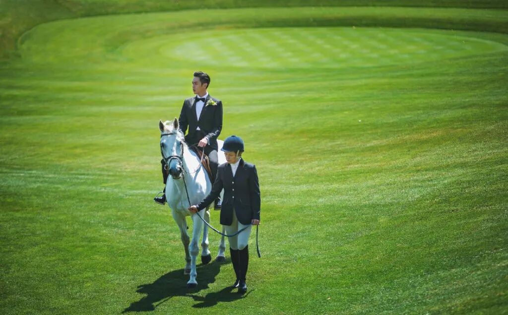 张先生化身童话中的白马王子,骑着白马进入婚礼现场