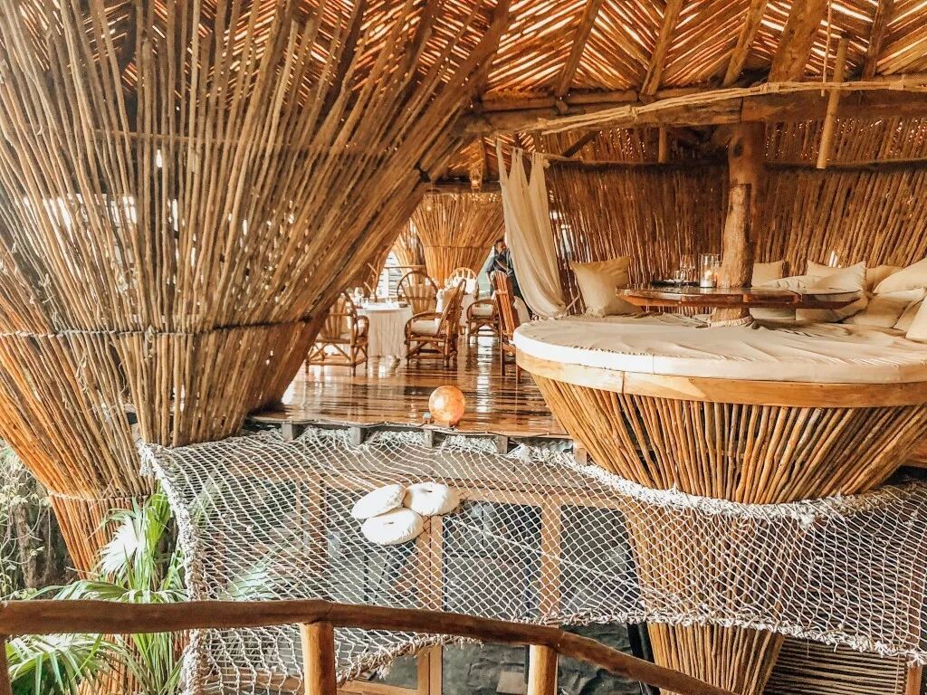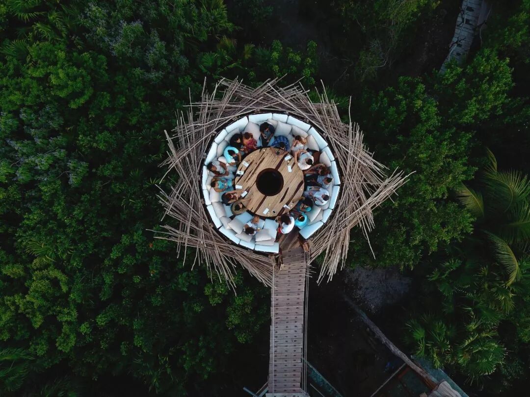 Kin Toh位于Azulik最标志性的所在——鸟巢。通过一条吊桥的指引,你将体验到这家悬浮在丛林之上的餐厅。相互交错的藤枝象征着生命最原始的蓬勃和张力,形似鸟巢形状的设计很好的与周围环境氛围相融合。