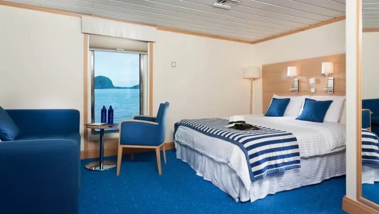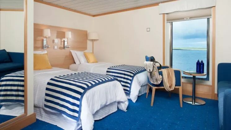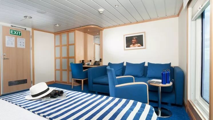 La Pinta拥有加拉帕戈斯群岛最大的船舱,一共拥有20个豪华客舱和4个特级豪华客舱,统一配备落地窗、沙发、私人浴室。所有客舱的床都可以根据需要配置成双人间或夫妻床(312客舱除外,只提供夫妻床)。4个特级豪华客舱可以相互连接,供朋友或家人一起旅行。