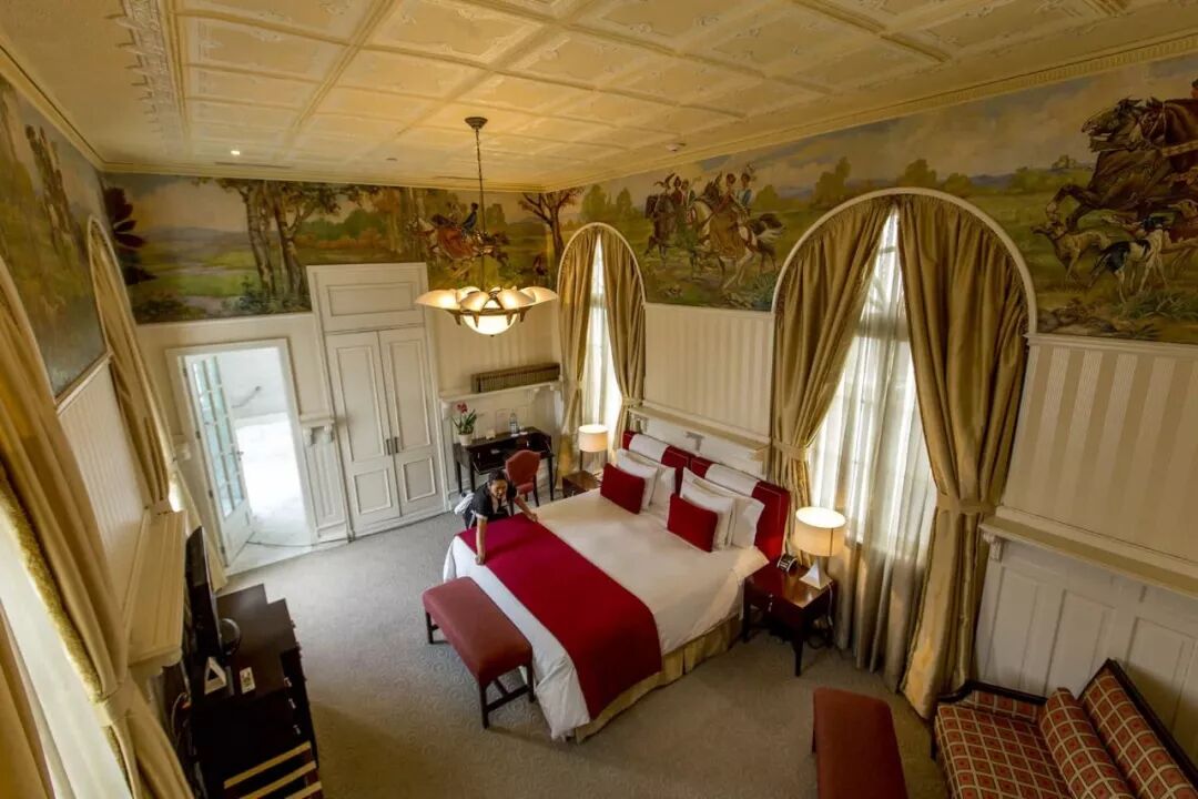 因一场意外火灾,这座住宅在1926年完全重建,是意大利建筑师罗素兄弟(Russo brothers)的宏伟愿景。殖民风格已经过时,取而代之的是华丽的柱子、喷泉和壁画。在这些壁画中,有一幅描绘的是骑在马背上的甘戈特纳一家。另一幅是在这栋豪宅西南翼的前日光房里,那里曾是社交贵妇们缝纫和闲聊的地方,展示了一幅壮丽的海景,配有各种各样的小帆船(现在是阳台小套间)。