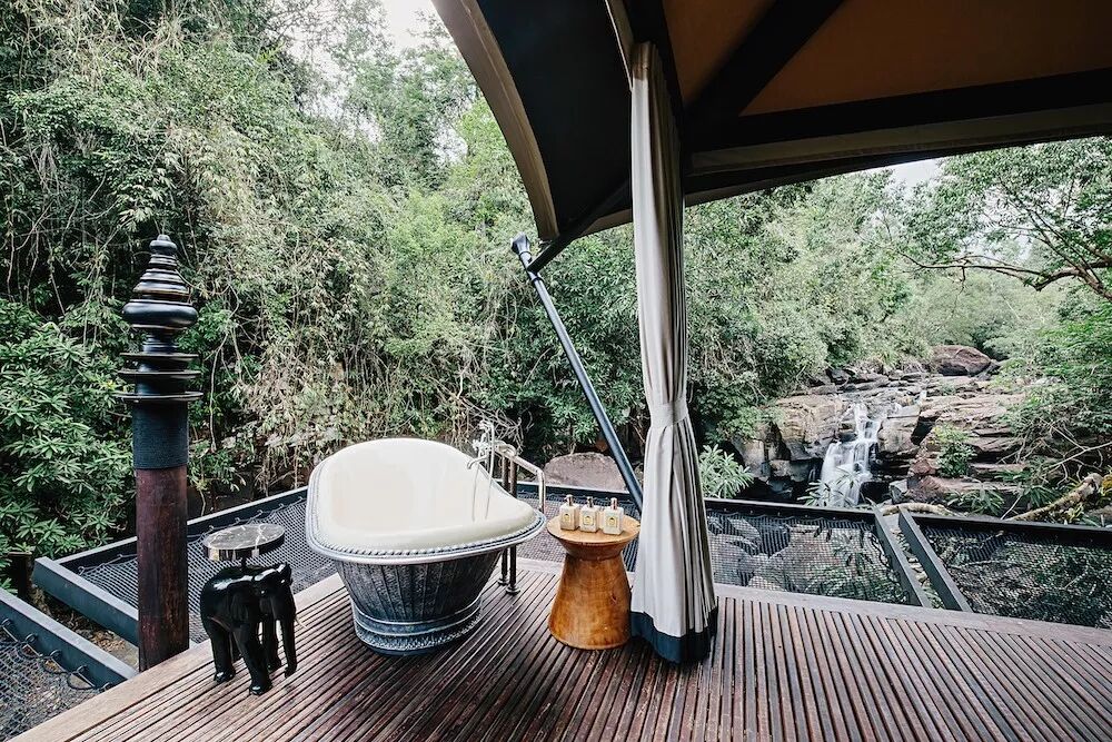 在1.5公里长的河流和瀑布沿岸,Bensley悬空架设了15顶100平米的野奢帐篷,地板下面就是湍急的河流和轰鸣的瀑布,为见惯了各种奢华酒店的客人带来前所未有的视野和非同凡响的体验。
