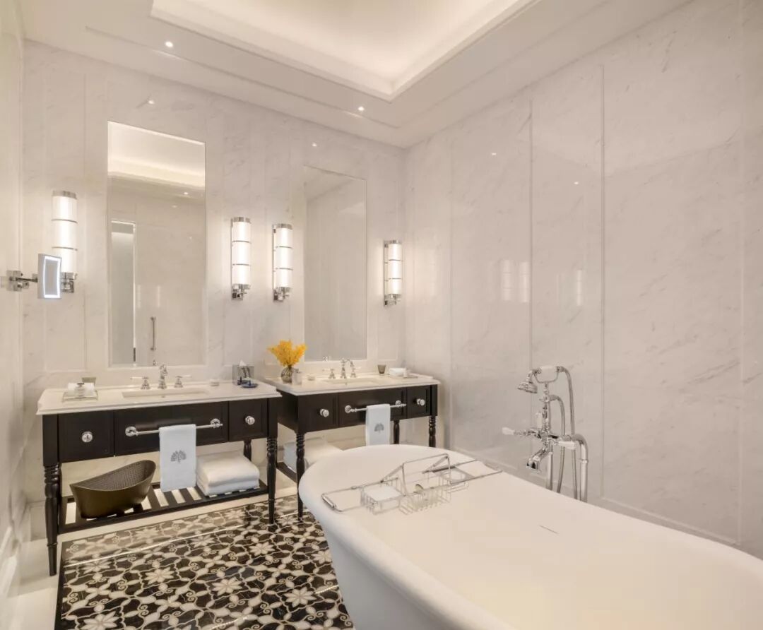 套房浴室经过重新设计,处处显现维多利亚时代的英式典雅,娘惹风格瓷砖则代表新加坡丰富的文化内涵。
