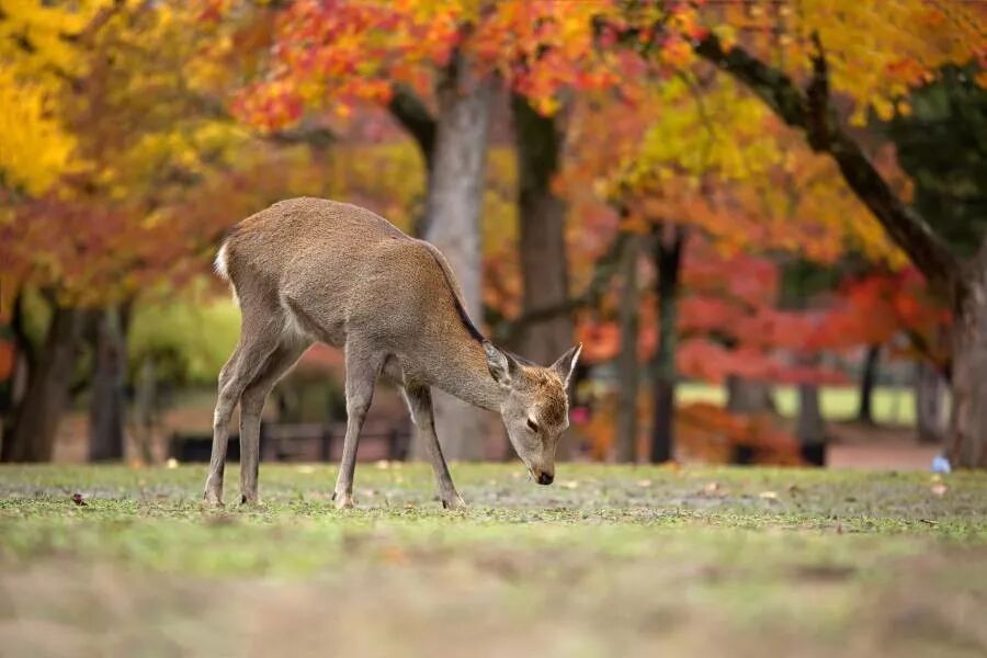 园内有许多嬉戏的鹿群,它们极富灵性,见到游人手上有鹿饼会主动走来,喂食萌萌的小鹿也是到此的一大乐趣。整座公园与自然完美融合,春季嫩枝发芽、秋季满园枫叶,都让人心旷神怡。