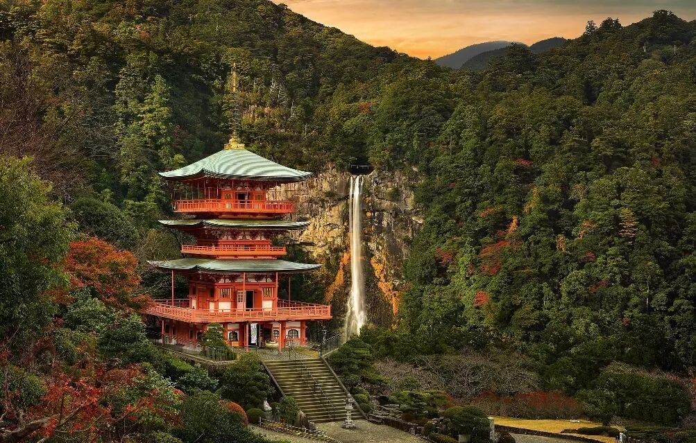 天赏樱,秋日赏枫,冬日泡汤,夏日在那智还有神秘的火节。落差133米的那智飞瀑令人叹为观止, 一侧的飞瀑神社将那智瀑布作为神圣的神灵象征!