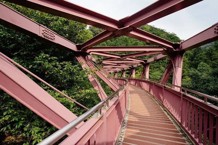 沿途的山林、幽径、流水和仙气足以治愈一切。通体樱花色的绫取桥有着流畅优美的走线,它穿行于密林之间、溪流之上,行走其间,惊喜重重。