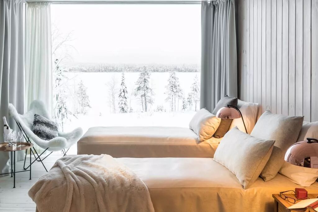 Seaside Glass Villas是当地最受欢迎的酒店之一。一排集装箱式白色房子整齐划一地排开,两面玻璃+玻璃屋顶,面朝波罗的海内海,既可以躺着欣赏无边无际的绝色海景,还能270°看极光!酒店边上就是漂亮的冰雪城堡;你还可以参加钓鱼和划独木舟等各种活动。