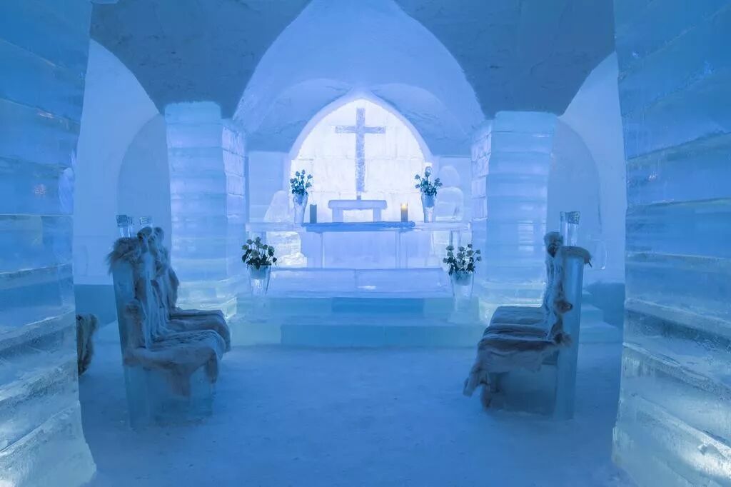 冰酒店初建于2000年,每天都会转换主题和设计,非常有新鲜感,大约有30间房,晚上约零下四至七度。寒冰床上铺了驯鹿毛皮床垫和温暖睡袋,绝对有足够暖度,不过亦建议穿上羊毛内衣及戴冷帽睡觉。冰房只有睡床一张,而使用更衣室、洗手间、淋浴室和桑拿都在温暖主大楼。