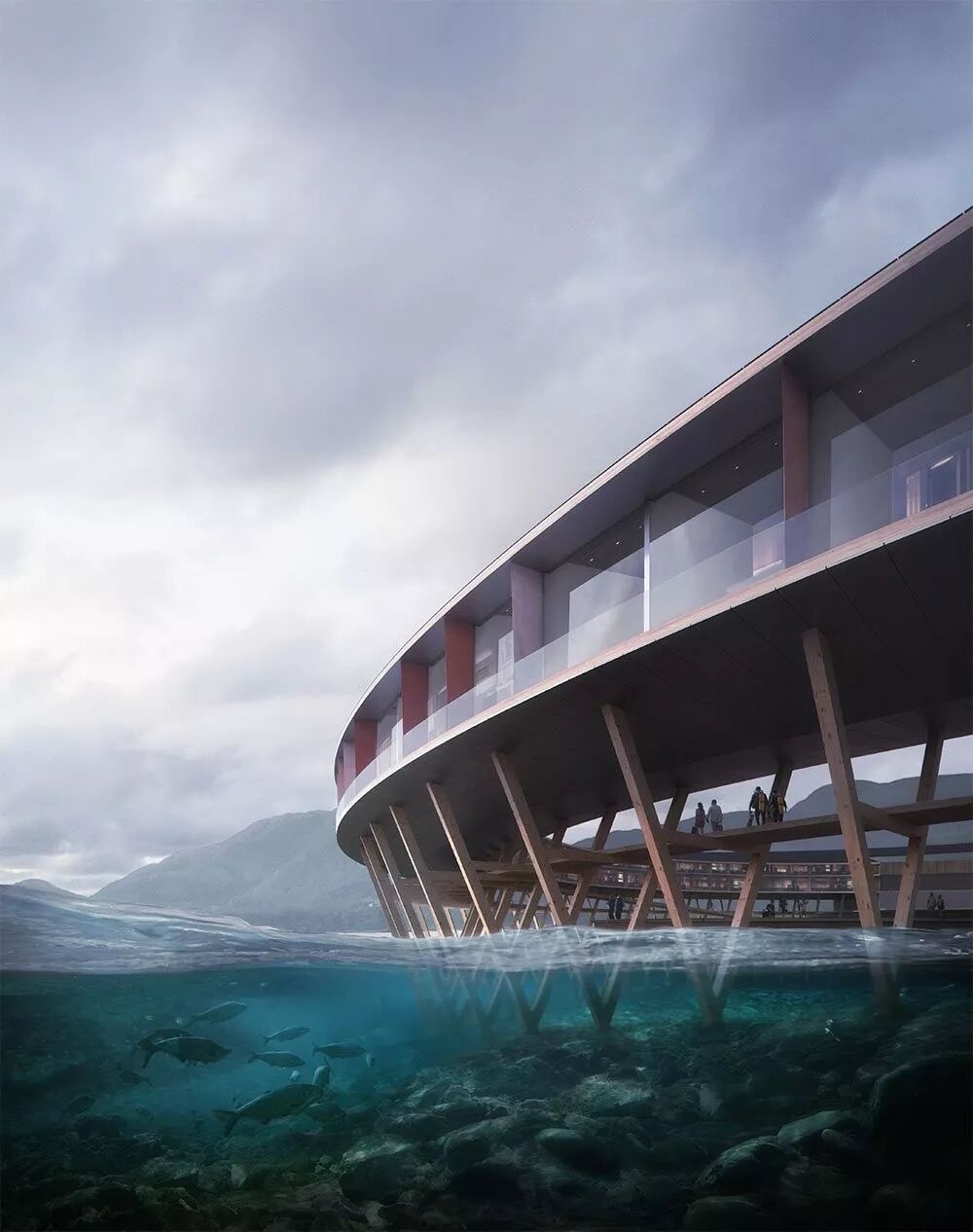 Snhetta向来以其大胆的设计而闻名,欧洲第一家水下餐厅Under就出自其手。Snhetta通过巨大的支架,将整个环形酒店撑起,避免直接在土地上建造和影响周围的植物群,在视觉上也能取得最棒的效果,真的就像一个飞碟驾临这片平静的水面——颇有外太空的科幻感!