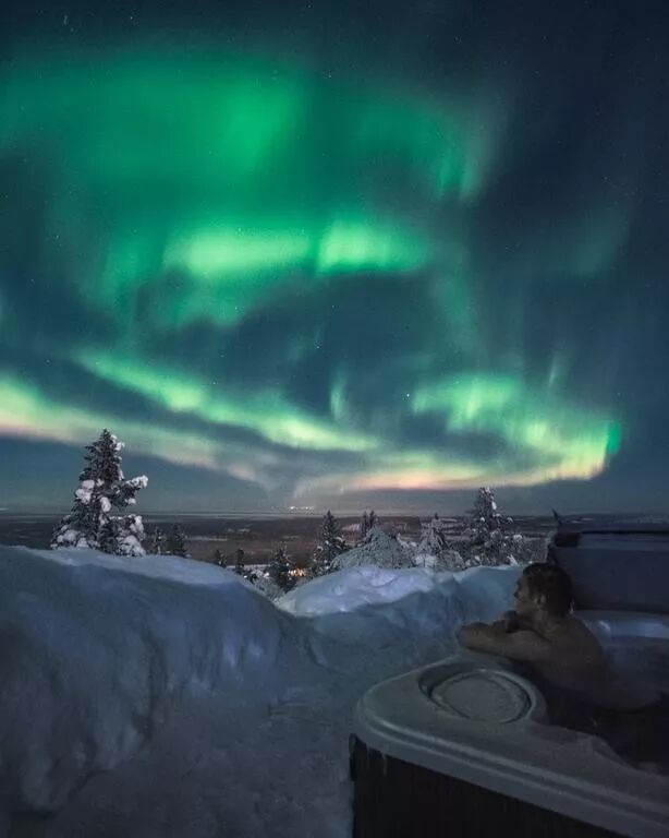 Golden Crown提供带完全隔热并加热的玻璃式圆顶冰屋,并统一配有带淋浴和吹风机的私人浴室以及电子可调节睡床。部分冰屋配备热水浴池和加大特大号床。冰屋享有一览无余的北方天空美景。如果幸运的话,你可以坐在冰屋内欣赏北极光。甚至,一边泡澡,一遍瞭望~