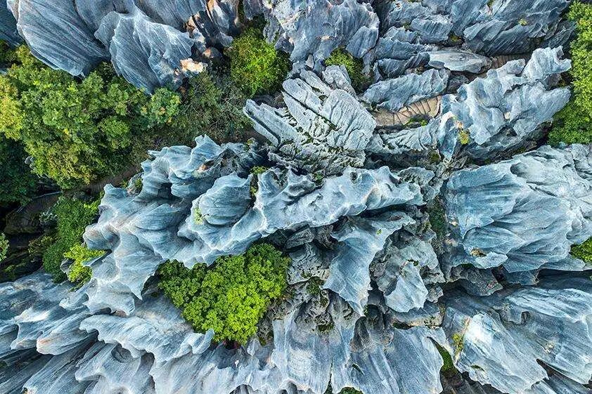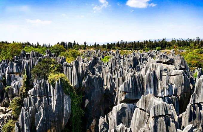 红河大裂谷把境内地形分为南北两部份,这里是横断山区和云贵高原的交汇处,南部为哀牢山余脉,山高谷深坡陡,地形错综复杂;北部为岩溶高原区,山脉、河流、盆地相间排列,地势较为平缓,喀斯特地貌尤为突出。隶属昆明,接壤红河哈尼族彝族自治州的石林,是喀斯特高原上的一处典型地貌。岩石被降水溶蚀成“千刀万刃”,放眼望去就像是石柱森林。