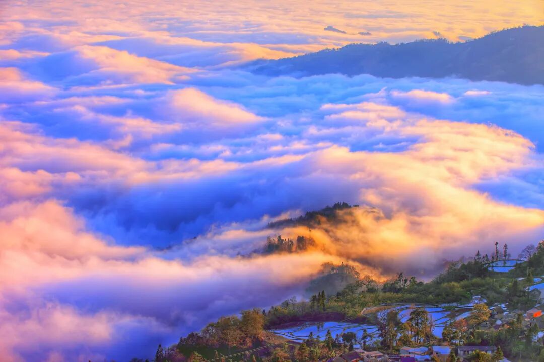 每天早上随着太阳的升起,温差的骤变,沉寂在山间的云雾开始自山间冉冉升起,缥渺弥漫于苍天山川之间,然后进入一个如海边卷起的巨浪般风起云涌的高潮,让人感受到大自然的气势磅礴。