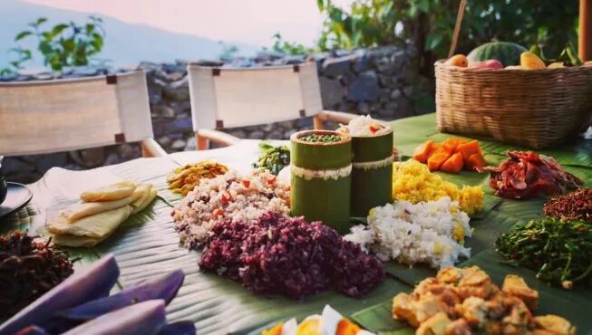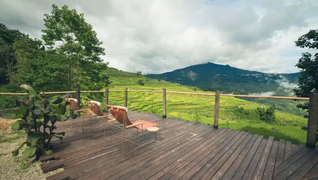 酒店餐厅会提供虫宴、哈尼蘸水鸡、干巴、山茅野菜、梯田鱼、红米在内的哈尼梯田特色餐饮。从这里可以俯瞰梯田和无边泳池,是营地视野最有特色的地方之一。