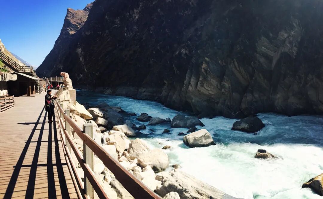 虎跳峡分为上虎跳、中虎跳和下虎跳,紧贴着江边修有公路。所谓虎跳峡徒步高路,即和公路平行的山路,垂直距离在一两千米,垂壁之上,坡陡路遥。