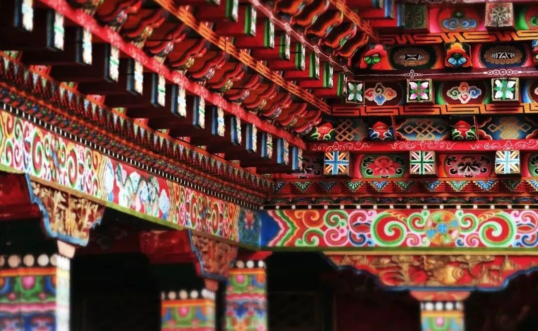 进入大殿,无声的庄严感让人不由得就安静下来。殿中供奉着诸多佛像,两侧西厢的壁画雕饰精美琳琅。建筑的屋檐,壁画勾勒着八瓣莲花,金鱼宝瓶,宝伞白螺等吉祥纹样。长桌上跳跃着火苗的酥油灯,有僧人正围坐榻几,低声言语。