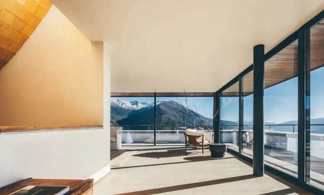它自然弯曲成漂亮的弧度,与两侧高窗一起将对面雪山的阳光反射进来,让整个酒店内部通体光明,在酒店内上下行走,仿佛是在金顶的光芒下攀爬天梯。