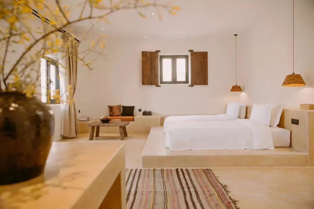 而在西麓,横亘着腾格里沙漠,它与乌兰布和、巴丹吉林两大沙漠相连,成为阿拉善荒原的重要组成部分,流动沙丘、半流动沙丘、密集的沙山是这里的主要景观。中卫最美“66号公路”穿越起伏的山谷,裸露的土坡,有些地方笔直呈40°延伸入峡谷深处。慢速一路往前开去,一眼望去都是黄土戈壁的荒凉美。在沙漠营地,白天畅玩沙海,夜晚遥望天空,感受大漠孤烟,漫天星辰的粗犷苍凉。在黄河宿集感受秀美绿洲的细腻一面,体验沙海中的蓝天、落日与星河。玩累了,就在泳池边放松一番,赴一场摩洛哥风情下午茶,三五好友谈天拍照,这些假期不可或缺的调调,在这里一次就能全部拥有。