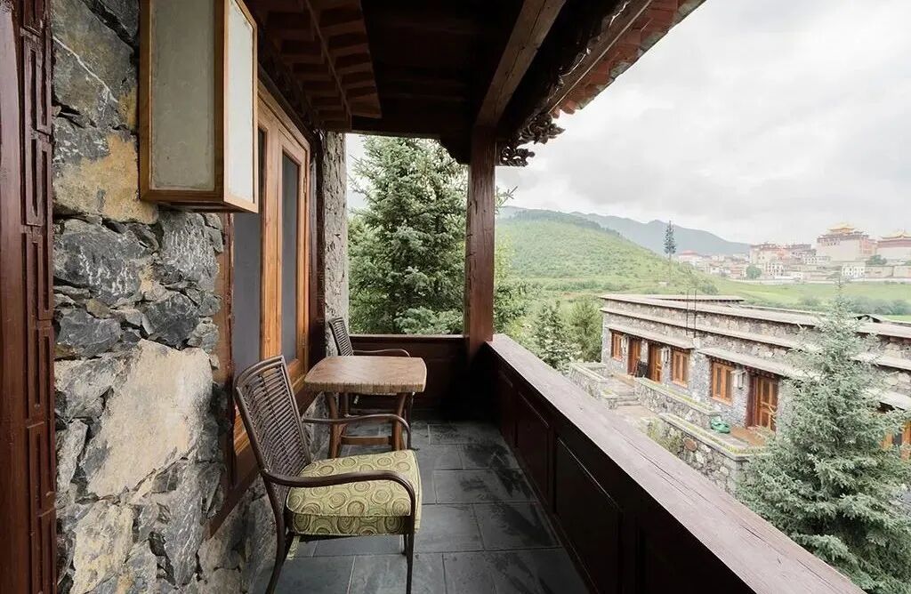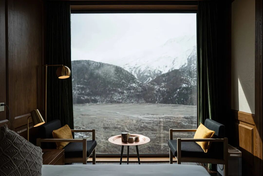 稻田、森林,村庄、梯田,千年银杏树以及如水乡般民居周围的鸢尾,每一步都有不同的秀丽风景。全木的纳西六扇折叠窗全开后如同画框,而这里的蒙太奇机位对着的是窗外远眺所见的达摩洞。酒店不远处的滇金丝猴保护区,是全世界唯一一个在野生状态下观赏金丝猴的国家公园。这意味着,人要顺着这些有灵性的小动物们的痕迹,去它们喜欢玩耍的那些不固定的地方寻找。让自然来主宰你的旅程,似乎更妙。只有清晨阳光驱散了云雾,才有可能一见泛着金光的梅里雪山,这是不少人心中可遇而不可求的圣景。这时,能与梅里雪山同样泛着金光的,还有松赞梅里山居。松赞梅里山居坐落在海拔3600米的山上,一个长久以来不曾被人提起,只有5户人家的藏族小村落谷久浓村中。面朝梅里雪山的主峰卡瓦格博是选址时考虑的首要因素之一。住在这里的客人,最期待的就是清晨能被管家的电话吵醒,然后听到那头激动的呼唤声:“快起床,雪山出来了!”避开人潮,走入这个茫茫天地间宁静又遗世独立的小世界中,所有的想法和观感都会变得简单纯粹起来。属于人性的“烦恼”,也许可以在这里得到一种奇异的纾解。