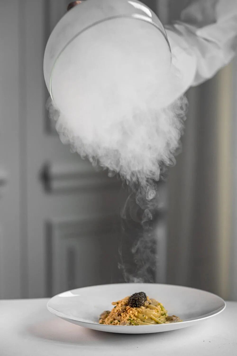 ▲烟熏意式扁面配蛤蜊及鱼子酱