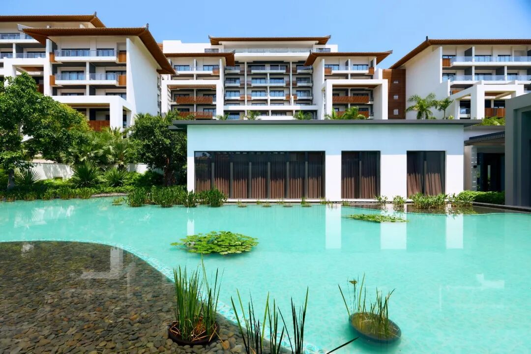 餐厅外纯白景观池,灵动流线,清澈池水倒映着挺拔苍翠的热带植物,别具异域风情。