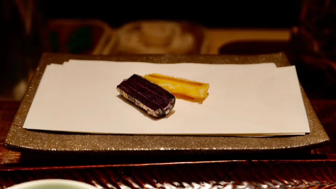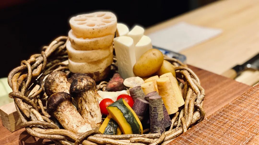 天吉究竟厉害在哪呢?个人认为原因有三。主厨元吉来自大阪米其林一星名店,功底扎实,尤其是对于食材的理解和把握能力,仔细探究,每一只天妇罗从食材的尺寸大小形状、面衣厚薄以及呈现形式都经过了精心设计,元吉丰富的经验功不可没。虽然主厨科班出身,但思维并没有被传统限制。在天吉,不仅能吃到传统天妇罗食材,更多地是他来到中国后的探索。板前落座,率先呈上的是一篮时令蔬菜,品种之丰富大胆令人惊喜,经元吉之手,即保留食材新鲜风味又带出更富有层次的香气,松茸丰腴多汁,莲藕又脆又润,紫薯绵密清甜,惊喜连连。而如果你认为天吉只是吃油炸食物,那就大错特错了,这里的酒肴也颇费心思。海螺片有马煮,蒸制白甘鲷,鹰嘴豆牛蒡酱油渍,梭子蟹土佐醋冻等,虽是小菜,却用料讲究、制作精良,味型设计起伏在天妇罗之间起到了重要的调整节奏的作用,让三十多道的course变得轻快愉悦。![]()