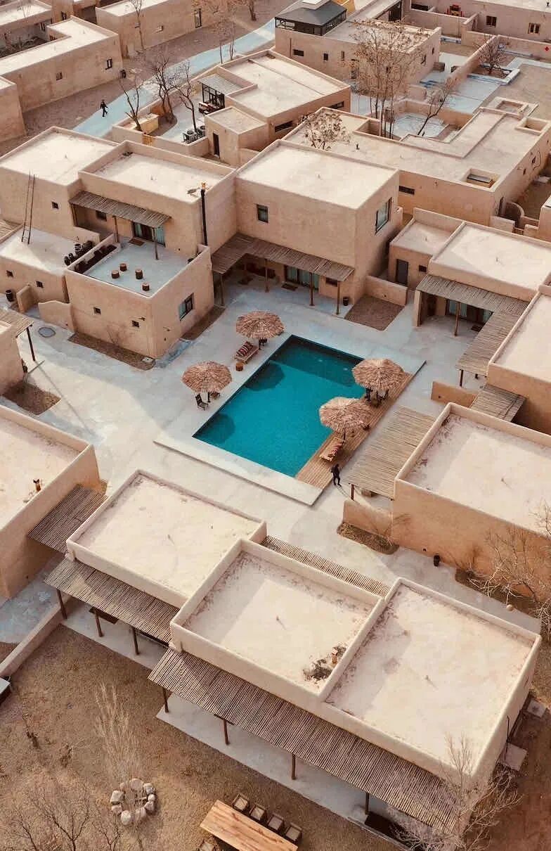南岸一共分三个院落,去年爆红的摩洛哥风情下午茶就是出自它家,户外泳池是它的一大特色。泥土房和手工编织的草席屋顶,复原了西北古村落的样式,古朴的外形下,屋内则是现代而舒适的现代荒野风格。