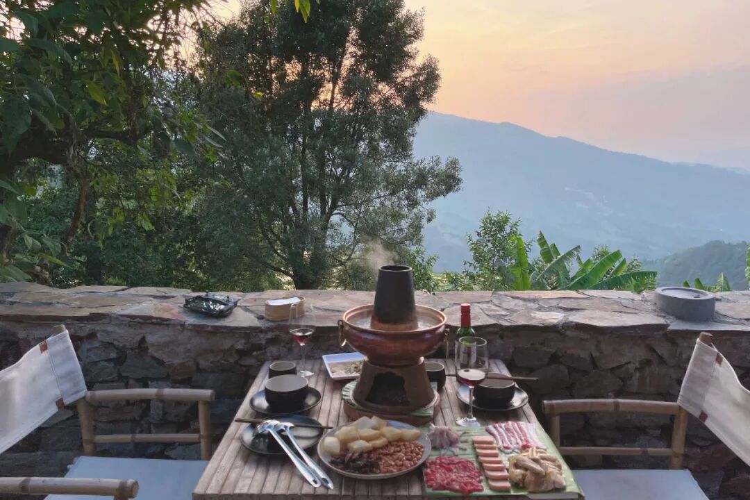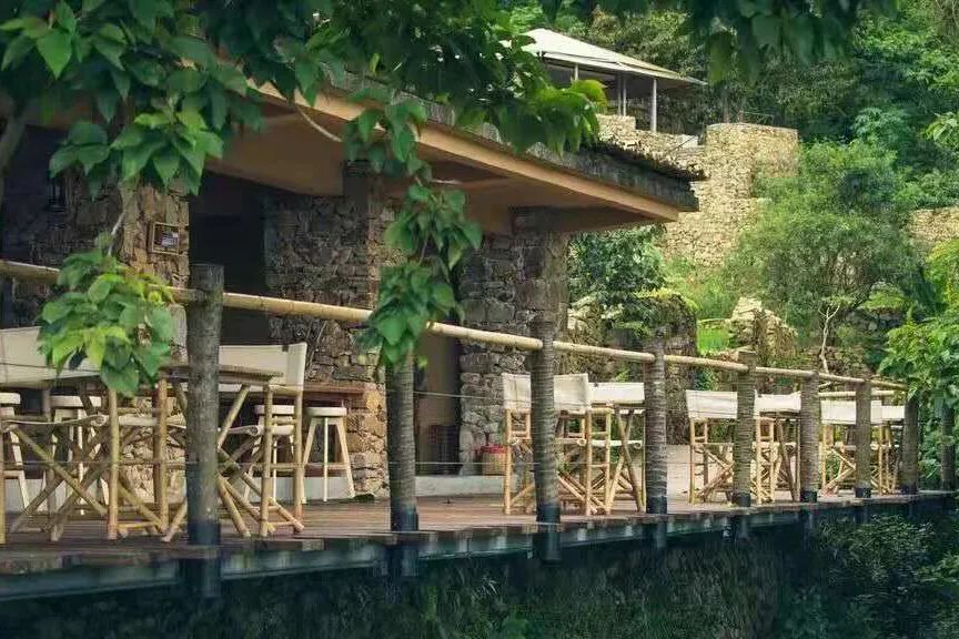 第一站先从人文历史气息较重的康藤红河谷开始,独特的人文气息永远是探访红河不变的主题。红河哈尼彝族自治州背面紧邻昆明,南部与越南接壤,西北面是哀牢山和红河,东北方有南盘江流过。独特的地理环境,让这里的风光带了几分东南亚的感觉。从远处看,仿佛从哈尼梯田之畔的断垣残壁上“长”出来的一般,营地以村寨遗址为基,完整保留了原始的石头与夯土老宅基底,面朝着万亩梯田。这片帐篷营地的灵感来自于考古学,设计师仿照考古学家的角度,慢慢梳理出了荒弃石头寨的村落肌理。在保持原本丰茂的基础上让建筑与植物重新整合,打造了这座国内首家“考古探秘”主题帐篷营地,同时又保留了红河本地的民俗文化。进入营地仿佛穿越到了石器文明的时代,石头堆砌的道路房屋错落有致,而茂密的热带树木又带来了几丝南方国家特有的风情,难怪被很多人称为“中式马丘比丘”风格。营地一共有17间帐篷,根据哈尼族文化分别被分成了森林、森林,水系,村寨,梯田四个不同的区域。帐篷之间有树木和矮墙掩映,偏高的地势可以直接看到哈尼梯田的壮观美景。帐篷内是能够勾起童心的探险家风格,白色和棕色的大量使用很难不让人想起在非洲草原上的帐篷时光,屋内还配备了地图、画架、望远镜,恍惚间仿佛穿越回到了考古事业蓬勃发展的18世纪。营地里最喜欢的地方除了可以无遮挡俯瞰梯田的观景平台之外,就是独具风情的泳池了。蓝色的泳池瞬间让营地的度假浓度升高,旁边还有可以燃烧篝火的区域。在泳池边赏梯田看日落,之后再烤一会火吃几口烤肉。最后回到房内的户外泡池,躺在其中看满天繁星,才算是视觉味蕾双满足的一天。营地的餐厅提供虫宴、哈尼蘸水鸡、干巴、山茅野菜、梯田鱼、红米在内的哈尼梯田特色餐饮。从这里可以俯瞰梯田和无边泳池,是营地视野最有特色的地方之一。除了各种角度、各种时间段花式观赏梯田之外,也由康藤营地的带领下体验了红河哈尼族人的许多民俗传统。