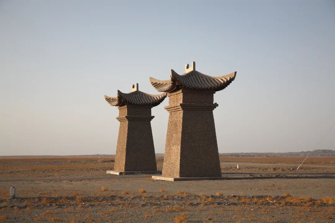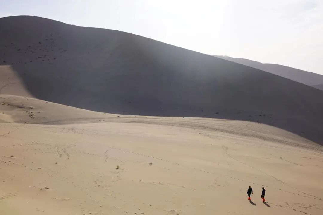 先坐着越野车在沙漠里穿梭漂移了一大段路,不知不觉就来到了人烟稀少的沙漠深处。再下车顺着软梯爬上沙坡,最后再沿着很窄的沙脊行走,终于找到了一片没有人的区域。四周都是一望无边的沙漠,天高地远,无比壮阔。阳关是汉长城最西端保留下来的原始建筑,至今仍然屹立于这处风沙之中,沧桑而孤独,而令人思绪万千。