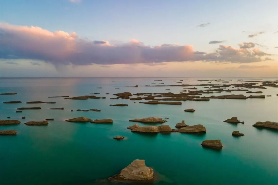 陆地上的雅丹地貌很多,但是水上雅丹却极为少有,这片水上雅丹是世界上惟一一片出现在水上的雅丹地貌。和陆上雅丹的成因差不多,水上雅丹也是戈壁在风蚀作用下形成的奇观。巧合的是,柴达木盆地的地壳运动让青海湖等地的湖水通过地下沁入了雅丹境内。形成了绝美壮丽的水上雅丹景观。当年由泥土构成的土堆早已风化成为岩石,巨石下水域宽广,波光粼粼。天空之上白云悠悠,远处雪山映入湖中,满眼如诗如画。无数座砂石巨塔树立在水面,远处还有数不清的群像,在这荒无人烟的地方看到这样的景象,似乎连时间流逝都体会不到了。傍晚的雅丹,碧蓝且清澈的湖水、粗狂而精巧的风雕,深邃又明净的天空。鬼斧神工般的丹霞地貌,天空鸭鸣雁啼,水上波光粼粼,朝阳橙霞,美不胜收。来之前很担心翡翠湖只是一个停留在美丽照片里的“网红”,来之后不仅见到了真实存在的大地翡翠,更是庆幸自己带了无人机来。