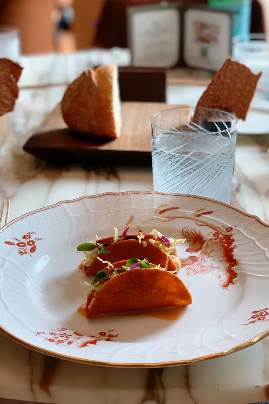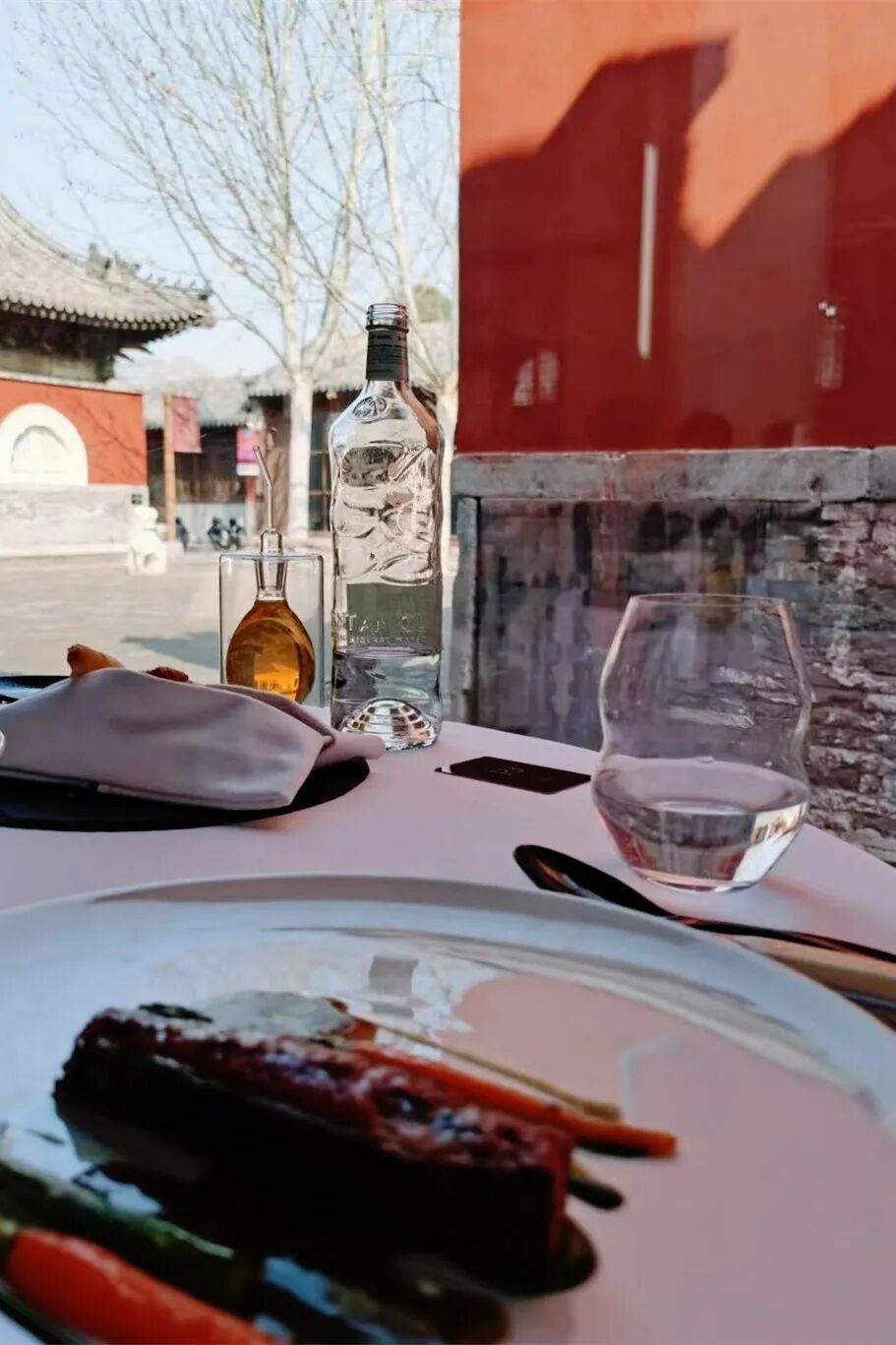一路观赏一路向前,走到寺庙最深处便是一间名为“回”的茶室。一壶茶加一份蜜饯点心,就可以在如此静谧充满古意的老宅里坐上一下午。不像传统北京茶馆一样热闹嘈杂,只有隔壁偶尔传来的古典音乐会演奏声,和天空飞过的鸽子扑棱声。静谧、古意与茶香一同漂浮在空气中。如果一不留神在茶社坐的时间稍久了些,不如就留在此处吃顿晚饭。TRB选择在这座寺庙开出旗下第二家餐厅TRB Forbidden City,与故宫仅几步之遥。抬眼窗外是真正的红墙琉璃瓦“皇城根儿”,低头桌上却是经典法餐,历史与时空的交错感充斥在视觉和味觉,是一种颇为奇妙的用餐体验。