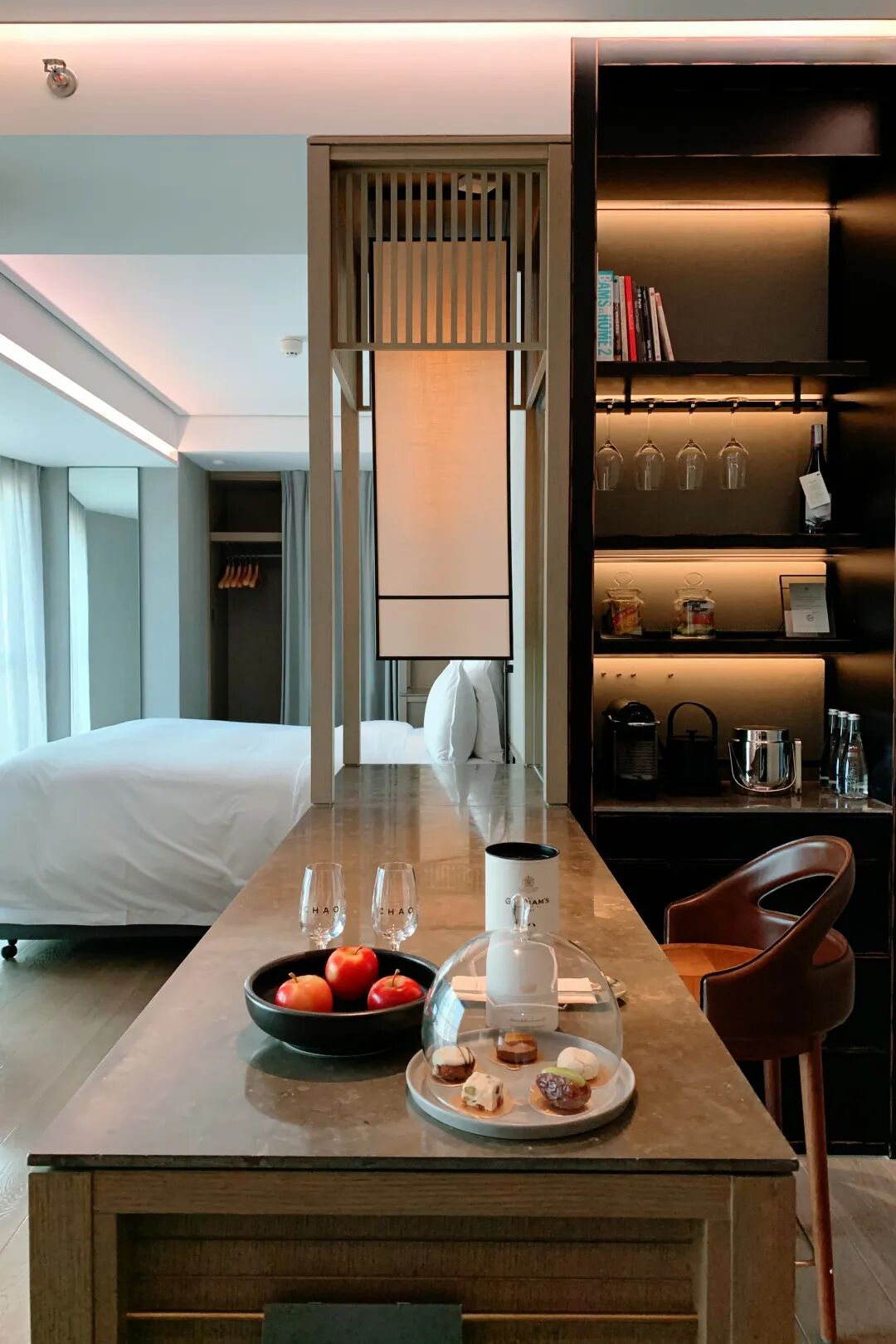 北京三里屯汇集着各类娱乐场所和精致餐厅,原以为三里屯CHAO为自己选址于此,是为了迎合年轻人的生活方式,但住过后才明白,连接社交与生活,穿梭于工作和休闲、享乐和居住,CHAO打造的是一种全新的旅居场景。CHAO并没有因为是一家年轻的酒店就放弃对细节的打磨。如果说咖啡机、多媒体音响和高织密度床品是酒店较为常见的细节优化,那么在关照情绪方面,CHAO的客房服务也做的同样优秀。此次入驻的是babysuite 50,入住房间后送上的welcome drink 是一瓶非常可爱的波特酒,mini bar里更是精挑细选,且全部免费。