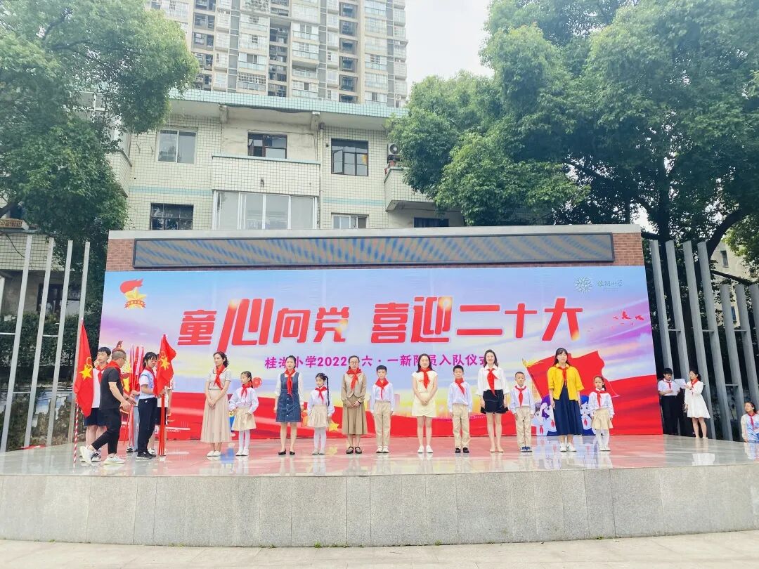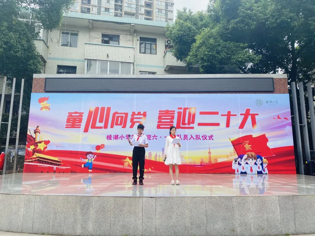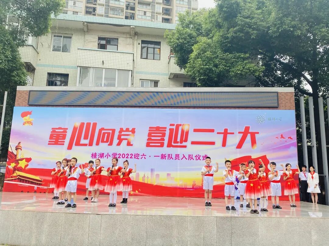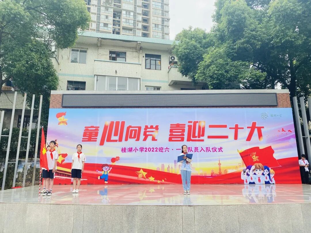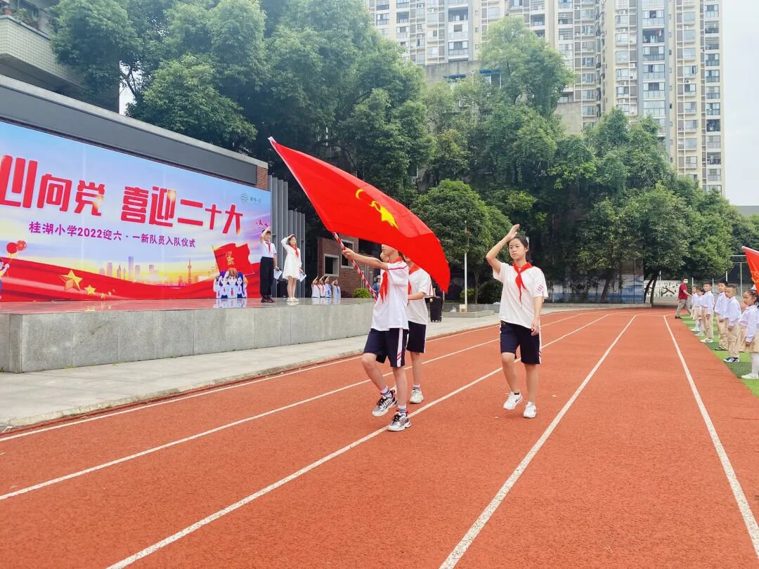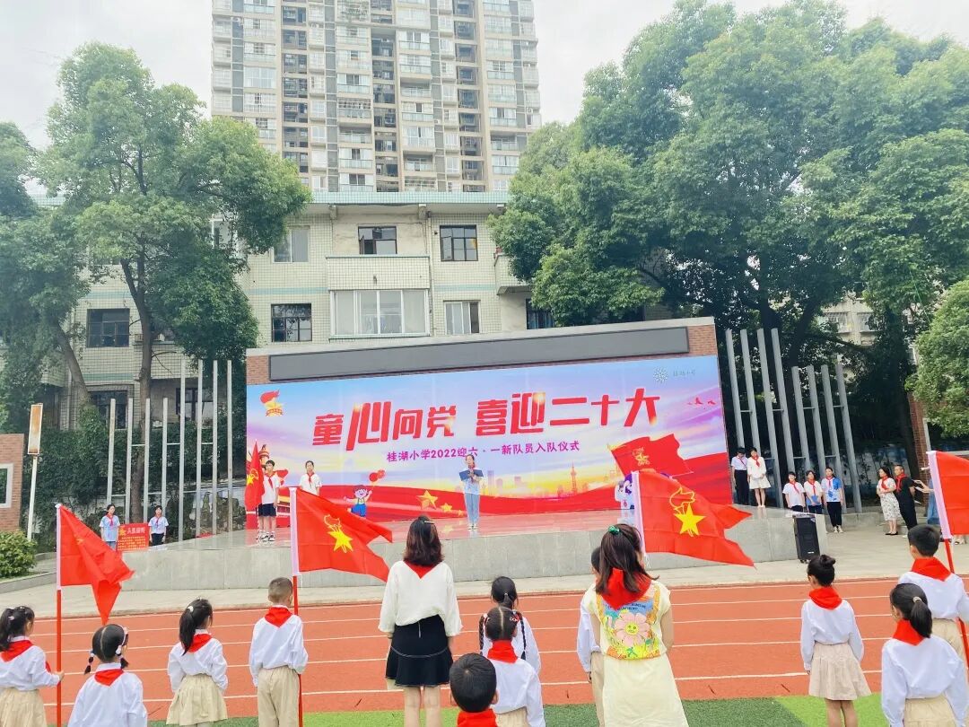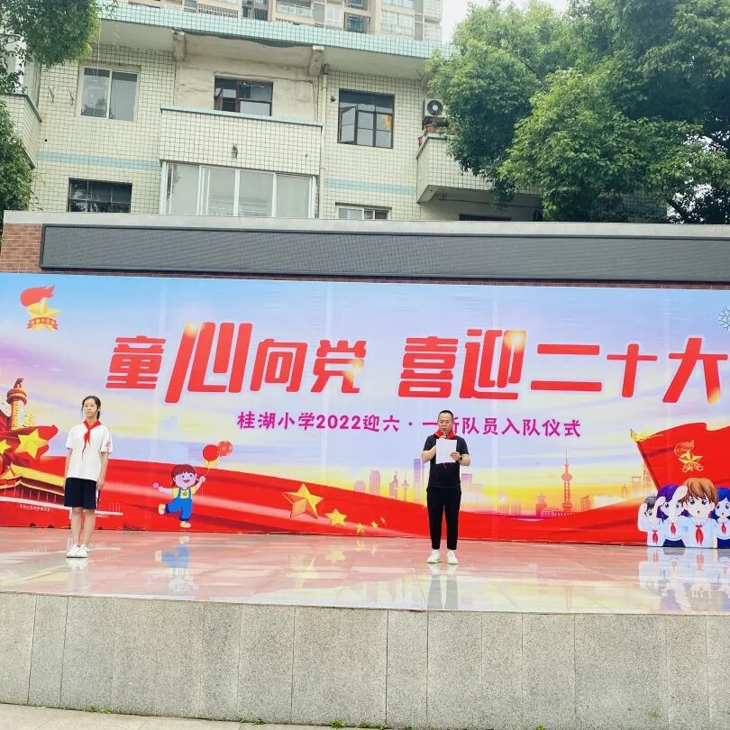 5月26日下午,在飘扬的五星红旗下,桂湖小学的孩子们队列整齐,意气昂扬。伴随着小主持一声“出旗”,桂湖小学“童心向党 喜迎二十大——2022年春迎六一新队员入队仪式”正式拉开了帷幕。在六一来临之际,孩子们用庄严的入队仪式向党的二十大献礼。