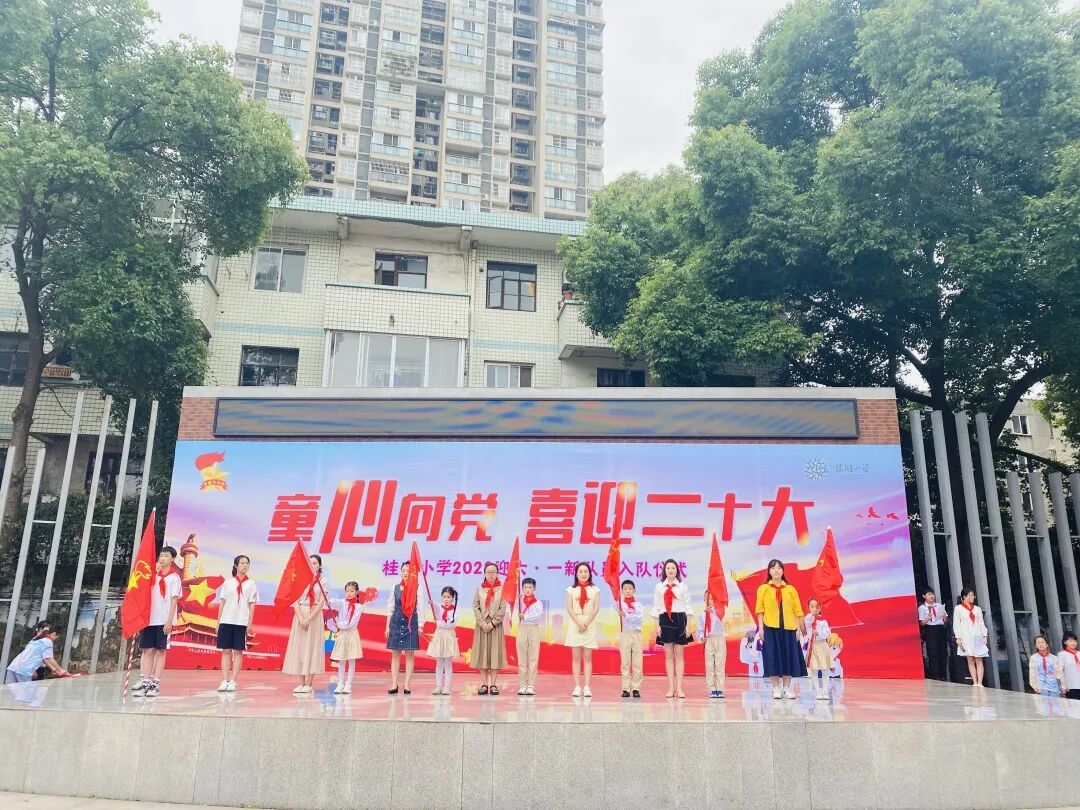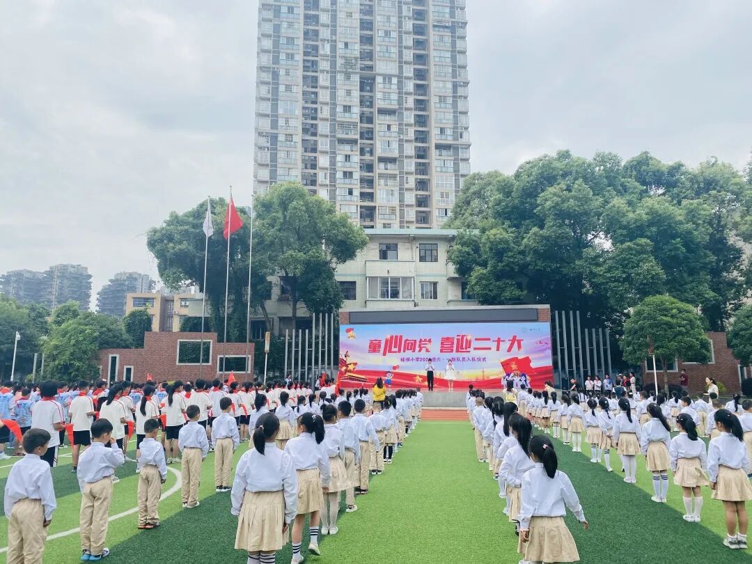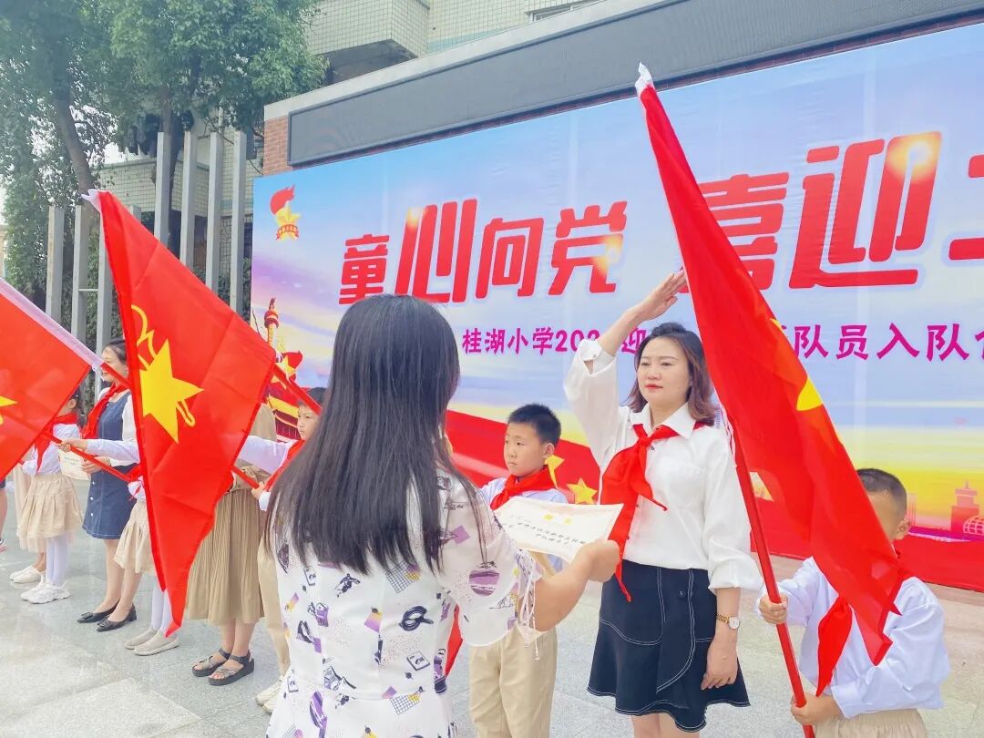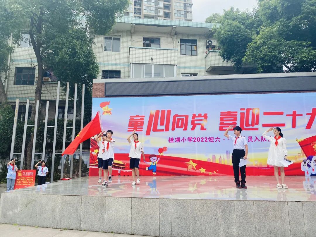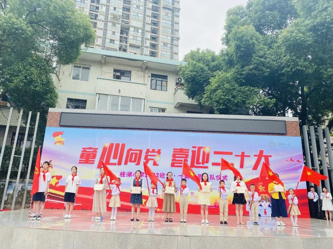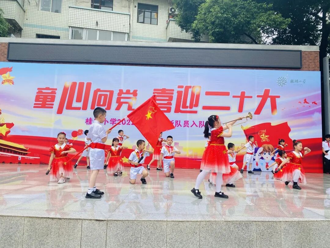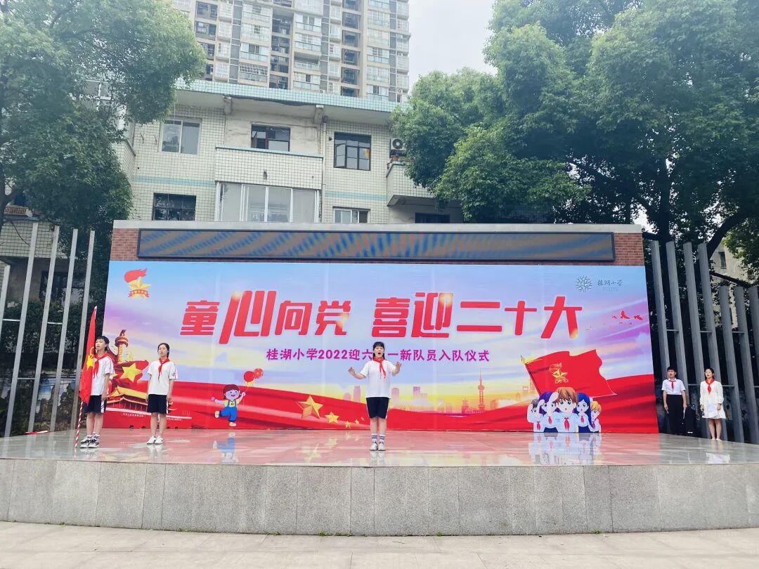 5月26日下午,在飘扬的五星红旗下,桂湖小学的孩子们队列整齐,意气昂扬。伴随着小主持一声“出旗”,桂湖小学“童心向党 喜迎二十大——2022年春迎六一新队员入队仪式”正式拉开了帷幕。在六一来临之际,孩子们用庄严的入队仪式向党的二十大献礼。