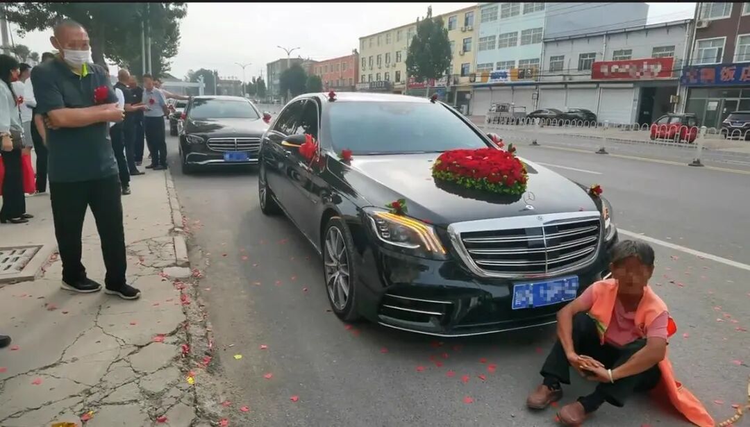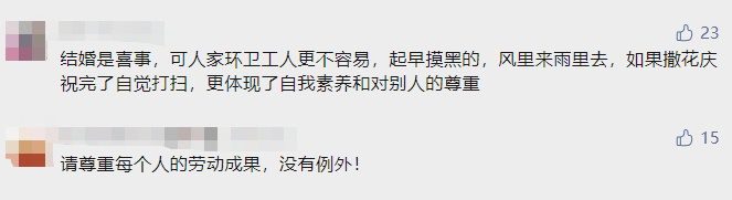 “从酒店接亲,接亲人喷了礼花,撒了一地,环卫大妈执意让接亲的人把地打扫干净。”拍摄者称,因为一时协商不下来,环卫大妈就坐在地上,拦着婚车不让走,最后接亲的人把地打扫干净了。